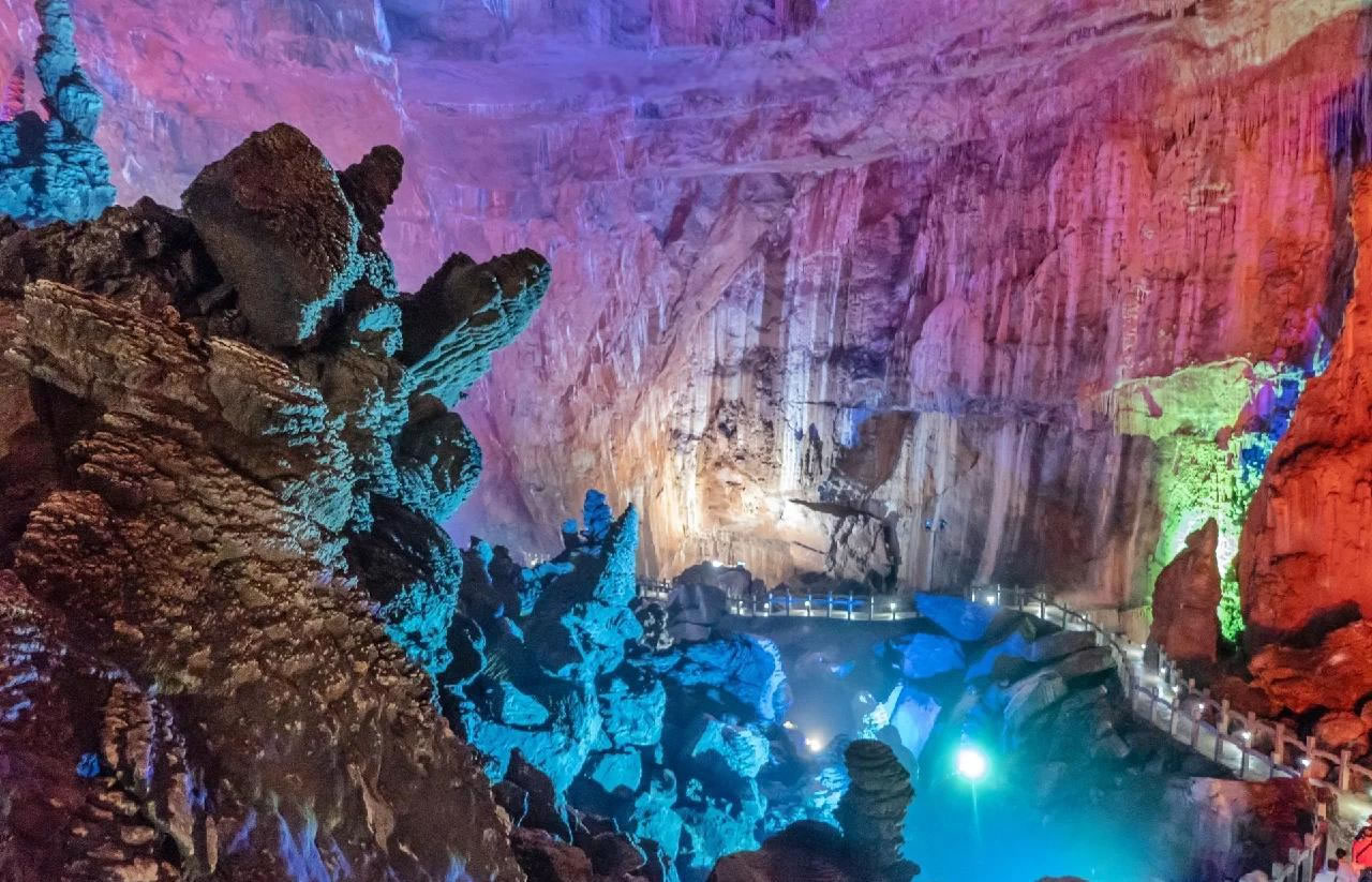 - 三絕:9.8米“定海神針”石筍、3.3公里暗河漂流、25500㎡巨型洞廳