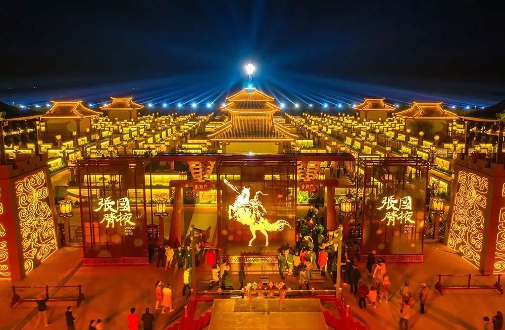 - 九曲黃河燈陣:占地150畝,全長2.4公里,按九宮八卦布局九大殿(關(guān)公殿、元始天尊殿等),設(shè)365桿旗、365盞燈對應(yīng)全年天數(shù),700余面文化墻融合二十四節(jié)氣、十二生肖、二十八星宿等傳統(tǒng)文化元素,夜間燈光秀與實(shí)景演藝《張國臂掖》結(jié)合,打造沉浸式漢唐市井體驗(yàn)。