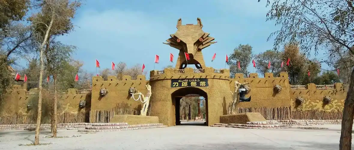 刀郎部落,位于新疆維吾爾自治區(qū)阿克蘇地區(qū)阿瓦提縣玉滿閘口胡楊林區(qū),距阿克蘇市58公里、縣城18公里,占地面積8300畝。景區(qū)以5000余畝千年原始胡楊林為生態(tài)背景,完整呈現(xiàn)刀郎人建筑、飲食及民俗文化,集中展示刀郎木卡姆、刀郎麥西熱甫等8項(xiàng)國家級和自治區(qū)級非物質(zhì)文化遺產(chǎn),其中“刀郎演唱組合”保持著最大年齡民間歌舞組合的大世界基尼斯紀(jì)錄。核心功能區(qū)包含民俗展館、千年胡楊區(qū)、鴕鳥養(yǎng)殖園區(qū)等七大板塊,復(fù)原刀郎人傳統(tǒng)居所與勞作工具,設(shè)有傳統(tǒng)手工藝作坊和勇士競技場,每日開展刀郎麥西熱甫展演、民俗婚禮體驗(yàn)及摔跤、叼羊等傳統(tǒng)體育活動(dòng)。2025年入選非遺進(jìn)景區(qū)“五好”案例名單,通過非遺傳承人駐場表演、慕薩萊思釀造工藝展示及沙雕主題公園等特色項(xiàng)目,形成生態(tài)觀光與民俗體驗(yàn)深度融合的旅游模式。景區(qū)內(nèi)保留狩獵場景、農(nóng)民畫長廊及高空輪轉(zhuǎn)秋千表演,配套沉浸式互動(dòng)體驗(yàn)和文創(chuàng)開發(fā)體系,實(shí)現(xiàn)刀郎文化的活態(tài)傳承。