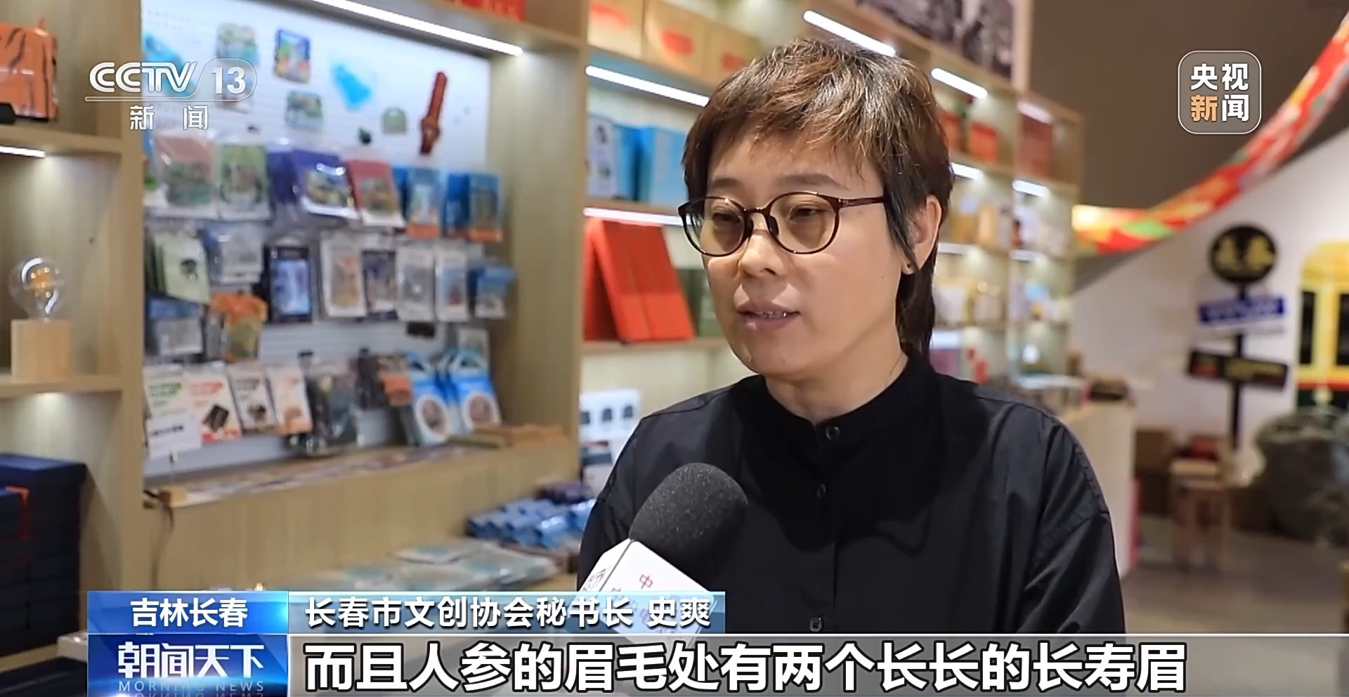 長春市文創(chuàng)協(xié)會秘書長 史爽:因為我們吉林省是人參的主要產(chǎn)地,上面的紅圍脖結合了我們原有的人參典故,系紅繩的這樣的一個典故,而且人參的這眉毛處有兩條長長的長壽眉,象征著吉祥如意。