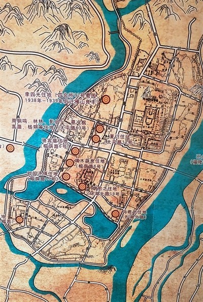 抗戰(zhàn)時(shí)期部分文化名人在桂林居住分布圖。