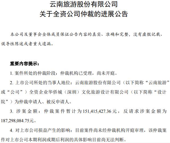 根據(jù)公司7月26日發(fā)布的公告,公司全資企業(yè)設(shè)計院就永州湘源文化旅游有限公司(以下簡稱“永州湘源”)未按照合同約定支付款項事宜向中國國際經(jīng)濟貿(mào)易仲裁委員會提起仲裁,仲裁案件金額暫計為1.51億元,該仲裁立案已獲受理,尚未開庭審理。設(shè)計院于近日收到通知,中國國際經(jīng)濟貿(mào)易仲裁委員會決定受理永州湘源提出的反請求申請,對方請求退回1億元啟動資金及支付占用費2304.67萬元等多項費用,涉及金額合計1.87億元。目前案件尚未經(jīng)仲裁機構(gòu)開庭審理。