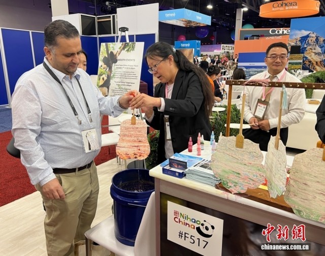 當(dāng)?shù)貢r(shí)間10月8日,2025年美國(guó)會(huì)議獎(jiǎng)勵(lì)旅游展(IMEX America)繼續(xù)在拉斯維加斯舉行。這是全球會(huì)議及獎(jiǎng)勵(lì)旅游領(lǐng)域最具影響力的展會(huì)之一。中國(guó)展臺(tái)舉辦“中華一刻”——中國(guó)非物質(zhì)文化遺產(chǎn)體驗(yàn)等豐富多彩的活動(dòng),吸引眾多與會(huì)者感受中華文化魅力。圖為與會(huì)者在中國(guó)展臺(tái)體驗(yàn)漆扇制作。