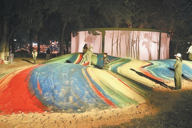 朝陽公園中心島,孩子們?cè)跓艄獠曙椀纳碁┥贤嫠!?/p>