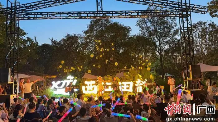 西江田韻休閑營地的草坪音樂會(huì)人氣爆棚。每日傍晚,草坪上坐滿游客,主辦方邀請多風(fēng)格樂隊(duì)、歌手現(xiàn)場演出,動(dòng)感流行曲與舒緩民謠交替響起,旋律在田野間回蕩。游客或鋪野餐墊圍坐,或站在草坪邊緣揮舞熒光棒,隨節(jié)奏輕搖,享受獨(dú)特音樂盛宴。