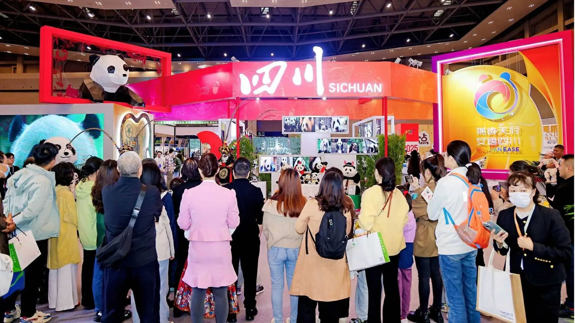 本次四川展臺(tái)位于展會(huì)核心區(qū)域,圍繞熊貓家園、古蜀文明、世界級(jí)旅游風(fēng)景道等主題打造展區(qū),F(xiàn)場(chǎng)不僅有諸葛羽扇綸巾杯套組等文創(chuàng)產(chǎn)品、缽缽雞等天府美食展示,宜賓面塑、長(zhǎng)寧竹編等非遺活態(tài)體驗(yàn),還通過(guò)川劇變臉表演、“安逸熊貓”人偶巡游營(yíng)造沉浸式氛圍。同時(shí),線下文旅咨詢區(qū)提供線路與政策解讀,百萬(wàn)粉絲達(dá)人巡館直播、“安逸直播間”系列活動(dòng)同步開(kāi)展,實(shí)現(xiàn)“線下體驗(yàn)+線上云看展”雙向聯(lián)動(dòng)。