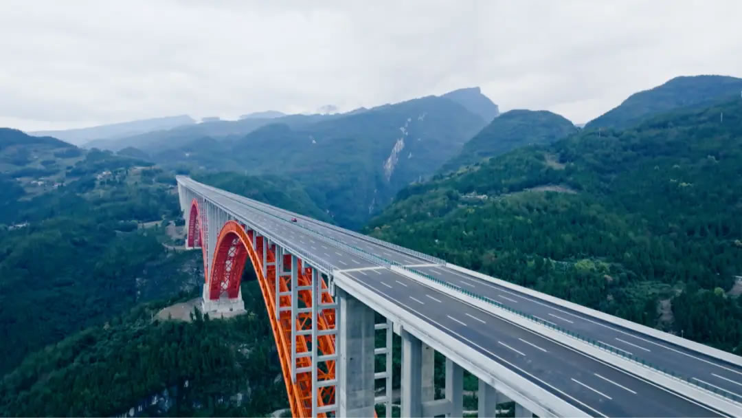 山澗云興霞蔚,雙虹飛跨天險(xiǎn)。橙紅拱如晨曦暈染,勾勒群山力量曲線;簡(jiǎn)潔的四肢鋼管,書寫出結(jié)構(gòu)美學(xué)的動(dòng)人詩(shī)篇。索道飛越,是工程與自然的和諧共舞;樁基深植,是技術(shù)與地質(zhì)的真誠(chéng)對(duì)話。雙堡特大橋連接山與山,更連接人與自然。